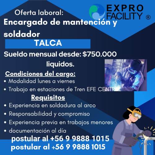 Ubicación: Ciudad de Talca Sueldo: $750.000 líquidos Horario: Lunes a viernes de 08:00 a 18:00 hrs Descripción del cargo: Se requiere Soldador para desempeñarse en labores de ...